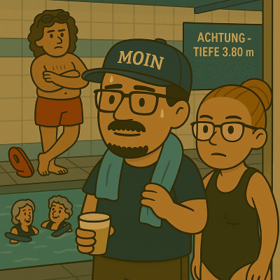 Rituale sind wichtig, auch für einen Quotenschwaben. Eins seiner wichtigsten Rituale ist es dienstags mit seiner Tochter schwimmen zu gehen, auch im Urlaub. Von eben einem solchen Erlebnis erzählt diese Geschichte. Lasst euch überraschen und lehnt euch zurück, wenn euch der Quotenschwabe mit ins Hallenbad nimmt.