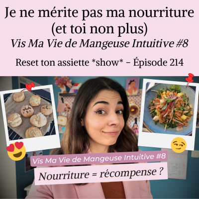 Non, tu ne mérites pas ta nourriture !🙅♀️ Dans ce nouvel épisode de Vis Ma Vie de Mangeuse Intuitive,)(dispo filmé sur YouTube ici : https://youtu.be/5UNBAkFzFMg [https://youtu.be/5UNBAkFzFMg]) je te partage des moments très concrets de mon mois de février dans mon alimentation et mon comportement alimentaire… et les réflexions qui vont avec. Le corps qui régule en mode calculette, envies spontanées de gourmandise, pourquoi je mange au final pas tant sucré que ça, ce que je pense de la nourriture comme récompense, les remarques qui m'ont gênée ce mois-ci... et plein d'autres ! Bref, une immersion dans ma vie de mangeuse intuitive qui s'écoute et se respecte ;) #badass et qui suit les principes de l'Alimentation Intuitive au quotidien. Bonne écoute ! 🔗 Ressources et accompagnements : 📩 Inscris-toi à ma newsletter féministe “Le Boudoir” → https://thelastquiche.fr/newsletter [https://thelastquiche.fr/newsletter] 📚 Cours gratuit “5 jours pour manger + intuitivement” → https://thelastquiche.fr/manger [https://thelastquiche.fr/manger] 🎙️ Ecoute mon podcast "Reset ton assiette" et les autres épisodes : → https://thelastquiche.fr/podcast-alimentation-intuitive [https://thelastquiche.fr/podcast-alimentation-intuitive] 🔥 Découvre mes accompagnements pour redevenir mangeuse intuitive, accepter ton corps, gagner confiance en toi... : → https://thelastquiche.fr/accompagnements [https://thelastquiche.fr/accompagnements] Prends un appel découverte ici pour échanger gratuitement sur ta situation et qu'on voit comment on peut bosser ensemble : → https://zcal.co/thelastquiche/decouverte [https://zcal.co/thelastquiche/decouverte] #alimentationintuitive#TCA#mangeuseintuitive#bodypositive#feminisme #antiregime