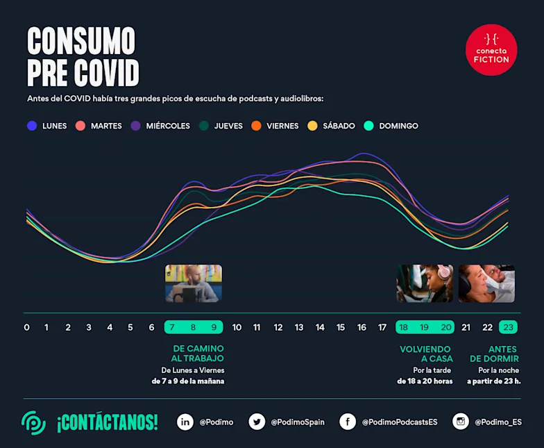COVID-19 está cambiando nuestra vida, en general, y también los elementos que la componen, en particular. Durante los últimos meses, los hábitos de escucha de podcasts y audiolibros en España y América Latina se han transformado de una manera nunca vista antes. Si en los años previos a la llegada de COVID-19 había tres grandes picos de escucha de podcasts y audiolibros (de lunes a viernes de 7 a 9 horas de la mañana en los desplazamientos al trabajo; por la tarde de 18 a 20 horas de regreso a casa y por la noche a partir de las 23 horas antes de acostarse), ahora eso ha cambiado.