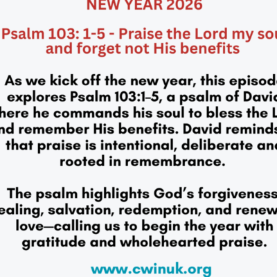 In this episode, as we intentionally kick off the new year, we slow down to reflect, reset, and realign our hearts by journeying through Psalm 103:1–5, a powerful psalm written by David. This passage becomes our guide as we step into a new season with renewed focus on gratitude, remembrance, and wholehearted praise. The process begins with David’s deliberate command to his own soul. He does not wait for emotions, circumstances, or external validation. Instead, he speaks directly to his inner life, ordering his soul and his innermost being to bless the Lord. This teaches us that praise is not always spontaneous; sometimes it is a conscious decision. David models spiritual leadership over self, reminding us that the soul must be directed, not allowed to drift. From there, the psalm moves into the discipline of remembrance. David urges himself not to forget the benefits of the Lord. This step is crucial, especially at the start of a new year when reflection is natural. Forgetfulness weakens faith, but remembrance strengthens trust. David walks us through a process of recalling God’s works—not abstract ideas, but personal, tangible benefits that reveal God’s character and faithfulness. The next phase highlights forgiveness and healing. David declares that God forgives all iniquities and heals all diseases. This shows us that restoration begins internally before it manifests externally. Forgiveness deals with the condition of the soul, while healing touches the body and mind. Together, they demonstrate God’s holistic care for His people—nothing is overlooked, nothing is too small or too broken. As the psalm unfolds, we see the process continue into salvation and redemption. God is described as the One who redeems life from destruction. This reminds us that God does not merely patch broken lives; He rescues them from paths that lead to ruin. Redemption is portrayed as an act of divine intervention, where God steps in and reclaims what was headed toward loss. David then shifts our attention to the benefits of love, compassion, and renewal. God crowns His people with lovingkindness and tender mercies, satisfying them with good things so that their youth is renewed like the eagle’s. This speaks to ongoing sustenance, not just past deliverance. The process of God’s blessing is continuous—He restores strength, renews vision, and empowers His people to soar again, even after seasons of weariness. Throughout this episode, we follow David’s example of intentional praise, disciplined remembrance, and deep reflection on God’s benefits. The process invites listeners to pause, look inward, and take inventory of God’s faithfulness in their own lives. As we begin the year, this psalm becomes both a mirror and a roadmap—calling us to align our souls with truth, anchor our hearts in gratitude, and step forward confident in the God who forgives, heals, saves, and renews. This episode ultimately challenges us to start the year not with resolutions alone, but with revelation—a clear understanding of who God is and all He has done, allowing praise to flow naturally from a soul that remembers.
