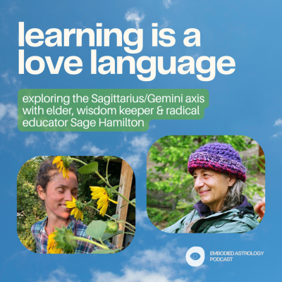 In this Sagittarius season/Gemini Full Moon episode, Renee invites their longtime friend and mentor, Sage Hamilton, to talk about her experience as a radical educator, storyteller, and community organizer. If you're interested in learning from or working with Sage, contact her at sagewaye(at)gmail(dot)com References from the conversation: * Melissa Michaels [https://goldenbridge.org/who-we-are/melissa-michaels/] * Meagan Chandler [https://www.meaganchandler.com/about-meagan/] * The story of Jumping Mouse by Hyemeyohsts Storm [https://archive.org/details/sevenarrows00stor] * Michael Mead - Living Myth [https://www.mosaicvoices.org/] * We Shall be Known by the Company We Keep [https://www.youtube.com/watch?v=0h5O2HZCVyQ], lyrics by MaMuse [https://www.mamuse.org/] *** Upcoming at EA*** 🤸🏽♀️ Drop in to a weekly Somatic Space class [https://www.embodiedastrology.com/somatic-space] with Renee Sills for embodied astrology, and to receive weekly orientation to / support for the upcoming transits. 🌕 Treat yourself to a self-massage in Capricorn Season! Join us Jan 3, 2026 on the Cancer Full Moon for CARE IS IN OUR OWN HANDS [https://www.embodiedastrology.com/drop-in-workshops/p/care-is-in-our-own-hands] ❤️🔥 12 week series: At The Heart of Conflict [https://www.embodiedastrology.com/heart-of-conflict] w/ Alisha Mawji & Amy Ashton - new cohort begins Saturday, Jan 3, 2025 (2 SPOTS REMAINING) 💞 If you're enjoying our work and want to dive deeper, our paid memberships [https://bit.ly/ea-memberships] include access to weekly Somatic Space classes, weekly astrology study groups, and the sweetest private community. 📣 To receive Embodied Astrology's free horoscopes in your inbox and be notified of upcoming workshops and events, become a free EA member [https://bit.ly/ea-member-community]. 🤿 Dive deep with our on-demand workshops [https://www.embodiedastrology.com/on-demand-workshops] 💸 Leave us a one-time or recurring donation [https://bit.ly/donate-to-ea] 💬 Reach out to us: office@embodiedastrology.com Thanks for all your support 💗