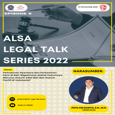 Episode ke-2 Season 2 podcast ALSA Legal Talk Series pada kesempatan kali ini hadir membahas sudut pandang Hukum Adat Bali dan Hukum Positif negara Indonesia terhadap adat di pulau Bali yaitu Perkawinan Keris dan Perkawinan Nyentana. Gita selaku moderator berdiskusi bersama Putu Ari Sagita S.H., M.H. yang akan memberikan pandangannya selaku Paralegal. Sebetulnya apa sih yang dimaksud dengan Perkawinan Nyentana & Perkawinan Keris? Apakah keduanya sah menurut Hukum Adat Bali dan Hukum Positif di Indonesia? Mari kita simak podcast kali ini untuk mengetahui jawabannya! Together as One: One Team, One Dream, One Family ALSA, Always be One!