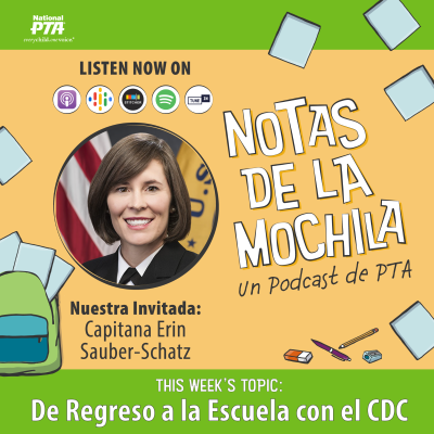 A medida que empezamos la segunda temporada de regreso a la escuela llenos de precauciones de seguridad por el COVID-19, es esencial mantenernos informados. Por eso, tenemos una invitada especial, la Capitana Erin Sauber-Schatz, que es la guía experta para la comunidad del COVID-19 Response del CDC, que nos contará las mejores maneras de evitar la propagación del coronavirus. Recursos: * Mire la Asamblea Virtual del Regreso a la Escuela [https://t.co/fYJd3ZHtyK] de National PTA organizada junto con el CDC. * Lea la Guía para la prevención del COVID-19 en escuelas de kínder a 12.º grado [https://www.cdc.gov/coronavirus/2019-ncov/community/schools-childcare/k-12-guidance.html] del CDC, sus Recordatorios para el regreso a la escuela [https://www.cdc.gov/parents/children/back-to-school.html] y la información sobre las Pruebas de detección del COVID-19 en las escuelas [https://www.cdc.gov/coronavirus/2019-ncov/community/schools-childcare/school-testing.html?CDC_AA_refVal=https%3A%2F%2Fwww.cdc.gov%2Fcovid19-school-testing%2Findex.html]. * Escuche el podcast de cinco minutos del CDC Transitioning Back to School or Early Child Education [https://tools.cdc.gov/medialibrary/index.aspx#/media/id/424704] (en inglés). * Explore el Kit de recursos parentales sobre el COVID-19 [https://www.cdc.gov/mentalhealth/stress-coping/parental-resources/adolescence/index.html?CDC_AA_refVal=https%3A%2F%2F], que está disponible en inglés y en español. * Siga al CDC en las redes sociales, en @CDCgov [https://twitter.com/CDCgov].