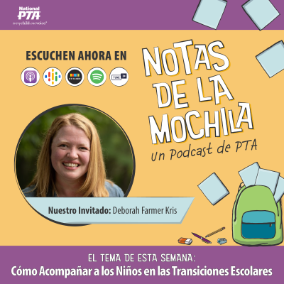 Las transiciones escolares pueden ser difíciles, y no solo para los niños, ¡sino también para los padres! Nuestra invitada, la experta en desarrollo infantil y escritora Deborah Farmer-Kris, nos cuenta algunos consejos para facilitar la transición escolar. Ya sea que sus hijos tengan dificultades para salir de casa por la mañana, sufran de ansiedad en el salón de clases o colapsen cuando llegan a casa, Deborah tiene un consejo para facilitar la transición escolar. Recursos: ● Conozca más sobre nuestra invitada, Deborah Farmer-Kris, enparenthood365.com [http://www.parenthood365.com/] y disfrute de su serie de libros ilustrados [https://aesopsfable.com/search?q=deborah%20farmer%20kris] con sus hijos. ● Consulte los consejos del CDC para Ayudar a los niños en la transición del regreso a la escuela [https://www.cdc.gov/childrensmentalhealth/features/COVID-19-helping-children-transition-back-to-school.html]. ● No se pierdan “Vuelva [https://ptaourchildren.org/morning-routine-tips/] a encarrilar su rutina“ en la revista virtual Our Children de PTA.